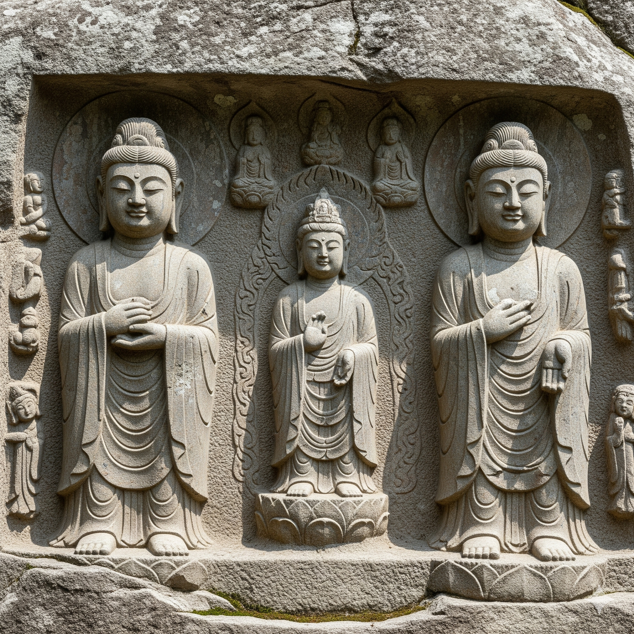 태안반도는 과거 백제와 중국 산둥반도를 잇는 중요한 해상 교역로였습니다. 이 마애삼존불은 험난한 바닷길을 오가며 안전을 기원했던 백제인들의 간절한 염원이 담겨있을 것으로 추정됩니다. 중생의 고난을 구제해주는 관음신앙의 특성을 보여주며, 당시 백제인들의 독창적이고 뛰어난 조각 기술을 보여주는 귀중한 유산입니다.