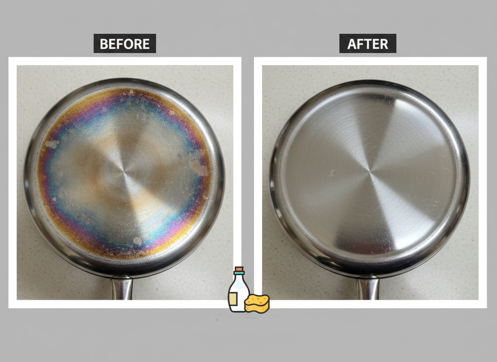 - 결과 확인: 신기하게도 무지개 얼룩이 마법처럼 사라지고 냄비 바닥이 원래의 광택을 되찾습니다.