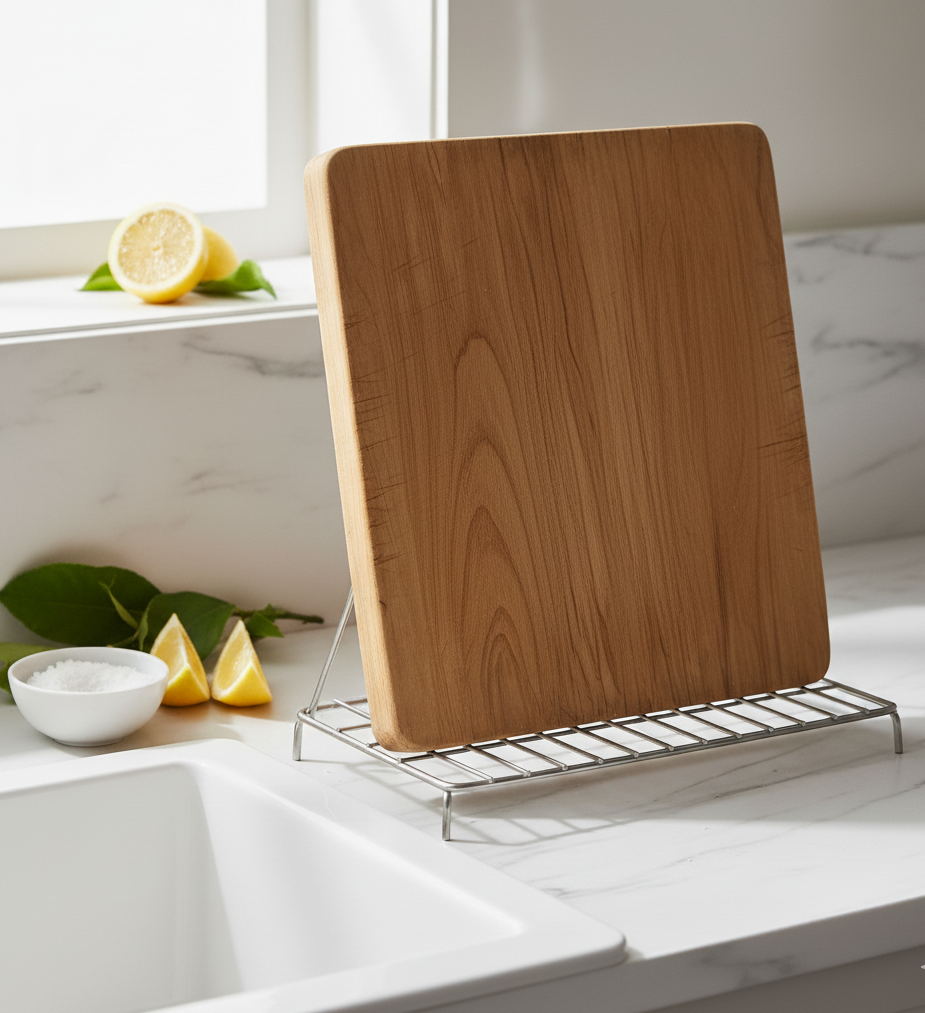 - 마지막으로 마른 행주나 키친타월로 도마의 물기를 완전히 닦아낸 후, 햇볕이 잘 들고 통풍이 잘 되는 곳에 세워서 말려줍니다. (가장 중요한 마무리 단계!)