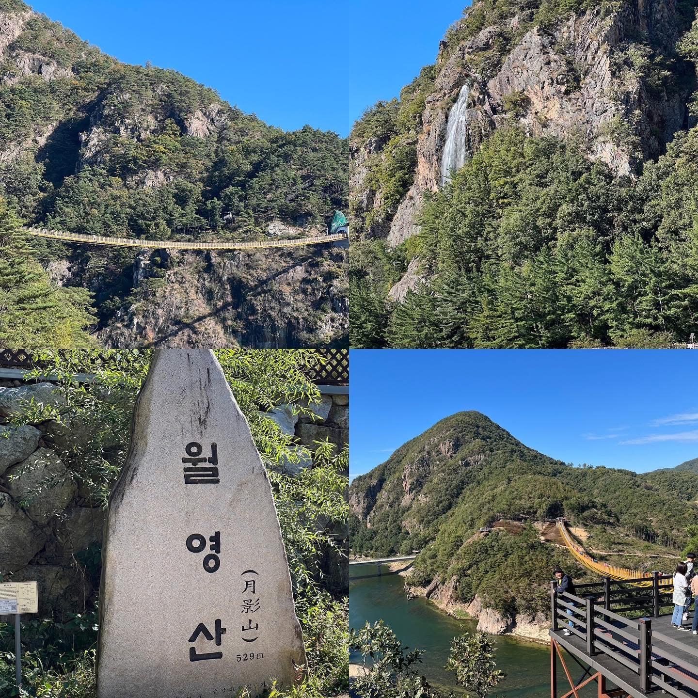 웅장한 월영산 절경 사이에 놓인 출렁다리를 건너는 짜릿함! 아래로 굽이치는 금강과 푸른 산세가 한 폭의 그림 같았어요. 🏞️ (월영산 표지석이 보이는 사진 속 산 높이는 529m!) 멋진 폭포와 기암괴석도 놓칠 수 없는 볼거리였습니다.