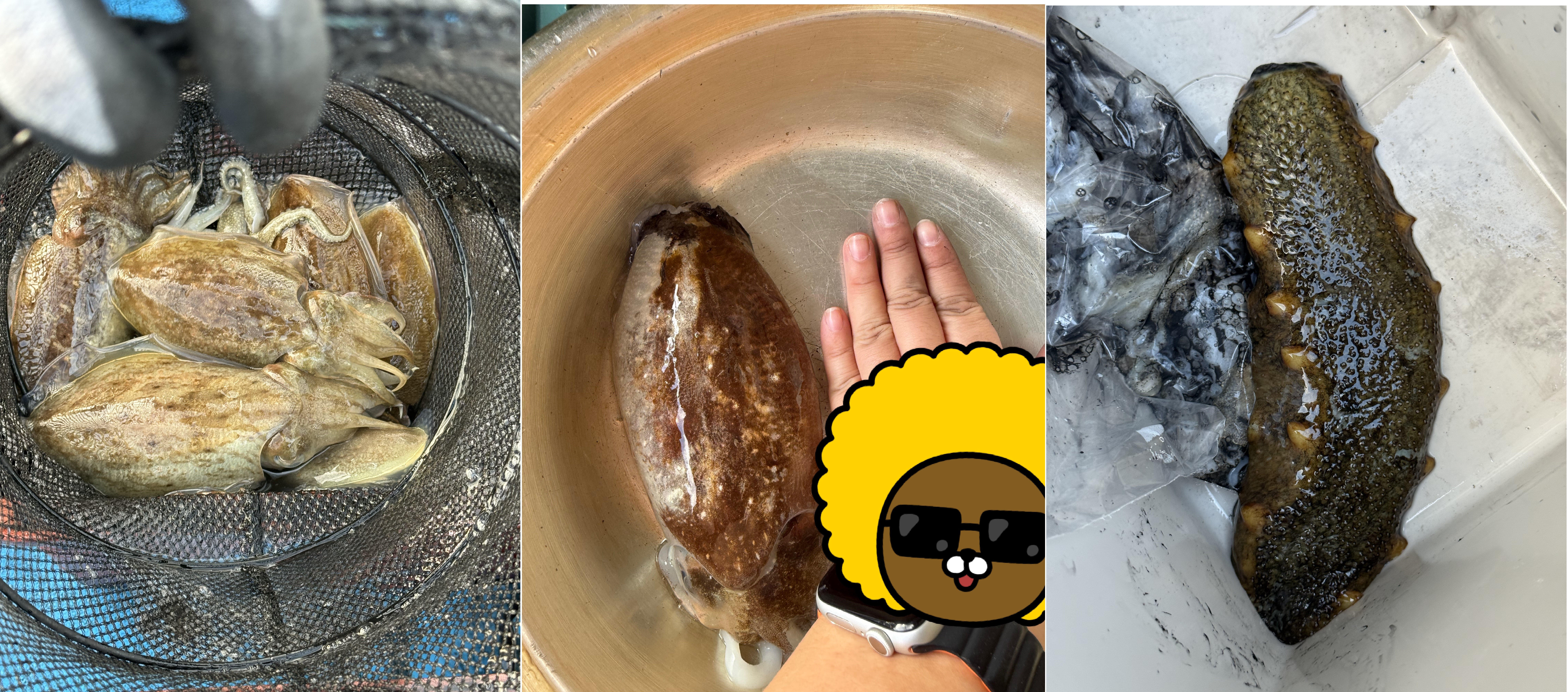 이날 잡은 갑오징어 중 가장 큰 녀석은 아내의 손보다 훨씬 클 정도였습니다. 배 위에서 신발짝보다 더 컸던 대물 갑오징어를 놓쳐 아쉬움이 컸지만 😭, 그래도 이 정도 크기라면 충분히 만족스럽습니다!